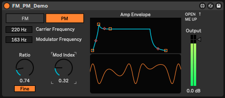 | Description: | This is a demonstration patch I made in response to a discussion on a forum regarding the differences between FM and PM synthesis. This can easily switch between both. It is a very simple mono synth with no bells and whistles. I wanted to keep it simple so that the patching concepts were evident to anyone who opens it up. To view the patching, click on the edit button on the device once it is loaded (there are 3 buttons on the top right, this is the left-most one with a squarish icon). Once the patch is opened in Max, it will likely load in "Presentation Mode". We need to change this to "Edit Mode" by pressing "command-E" on a mac, or "control-E" on windows. I tried to label and organize everything so that it could easily be traced and understood. One note of usability: I noticed that when you are adjusting the Ratio in Course mode, it can get stuck if you are trying to move it from 0. The work around is to switch to Fine mode first to move it above 1, then switch back to Course. I included the oscilloscope which works well in curtain frequency ranges, and only only with gentler modulation. If you need a better one, the free Melda MOscilloscope is pretty good. I'd also highly recommend dropping a Spectrum analyzer after the device to see what is really going on with each method. |