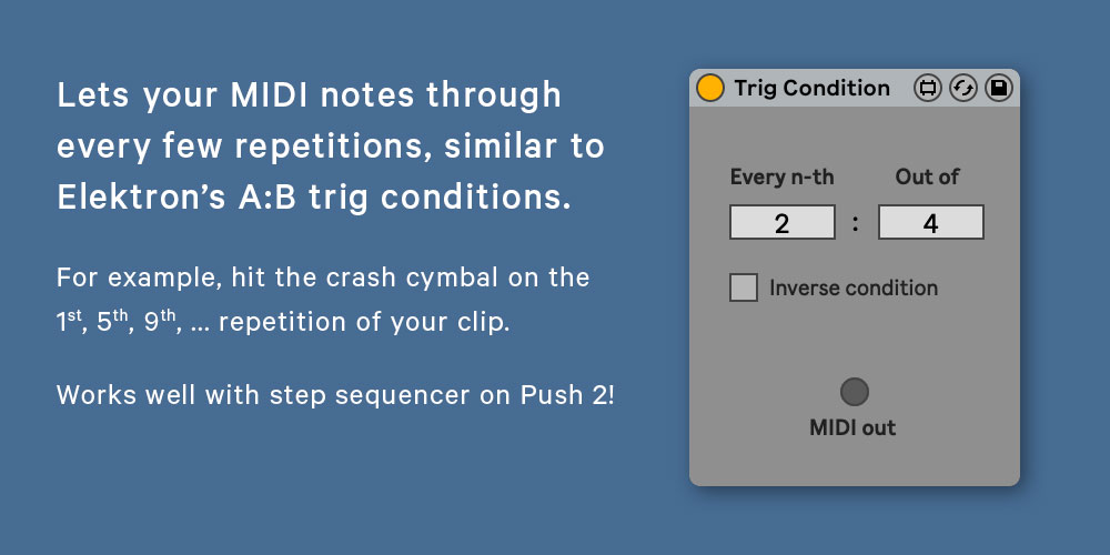 | Description: | Lets your MIDI notes pass through every few repetitions of the clip, similar to Elektron’s A:B trig conditions. 'Every n-th' sets how many times the clip plays before the trig condition is true. 'Out of' sets how many times the clip plays before the count is reset and starts over again. This cycle then repeats. For example, with the setting 2:4, the trig condition is true the second time the clip plays and then the sixth, the tenth, and so on. - Push 2 ready - Try automating in Live's step sequencer - Try adding to each pad in a drum rack - Works with session clips as well as arrangement clips - Invert condition (play every time except n-th repeat) |