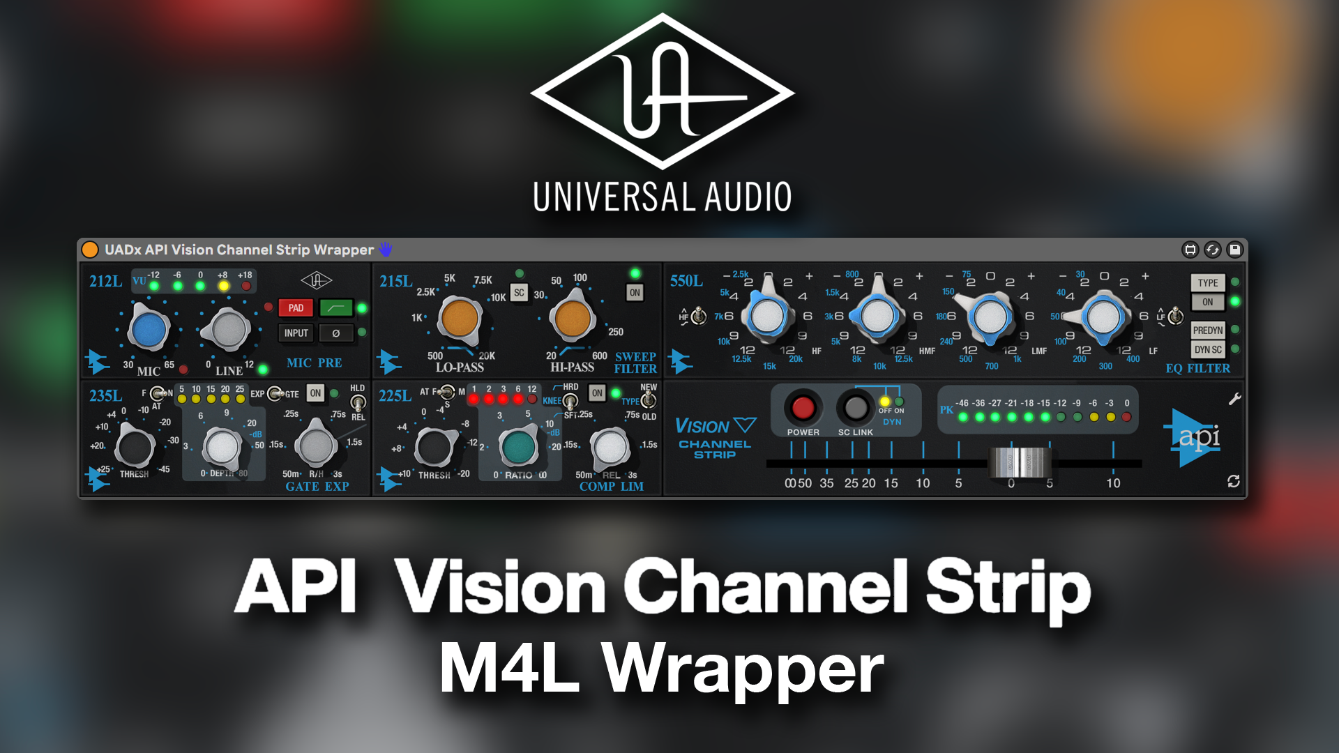 | Description: | With this m4l device you will be able to use the Universal Audio API Vision Channel Strip plugin like an Ableton native one. This includes mouse clicking, midi mapping, automating, visuals, etc. Native version and hardware version included (UAD and UADx) AudioUnits and VST3 versions for both native and hardware. This is a Wrapper, so you still need to own the UAD plugins (you can get it here: https://spark.uaudio.com/). Video example: https://youtu.be/jYGZEdCDWco Get the Preamps, EQs & Channel Strips Wrappers 40% off here: https://udorbrauna.gumroad.com/l/UADPreEQChStrPackWrappers ------------------ Updated v1.2: Solved some issues with Windows PCs and VST. Updated v1.1: Improved the accuracy of the leds. Added sidechain options. Now the device latency matches the plugin latency (so Ableton can "delay-compensate" it correctly). |