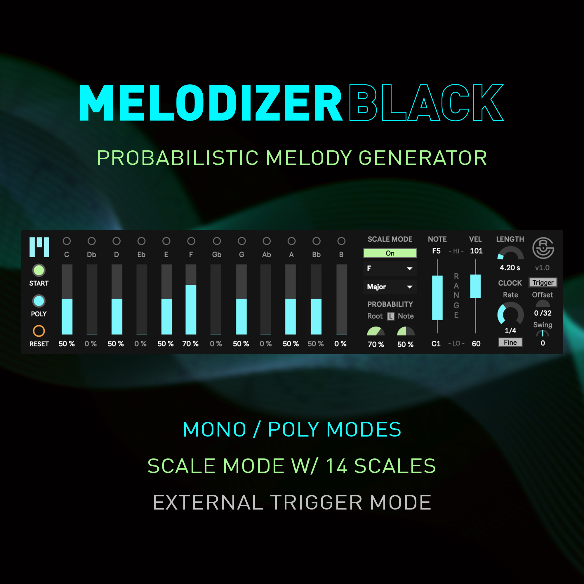 - Robust scale mode which includes 14 scales to choose from and knobs to quickly adjust all probability sliders in your scale