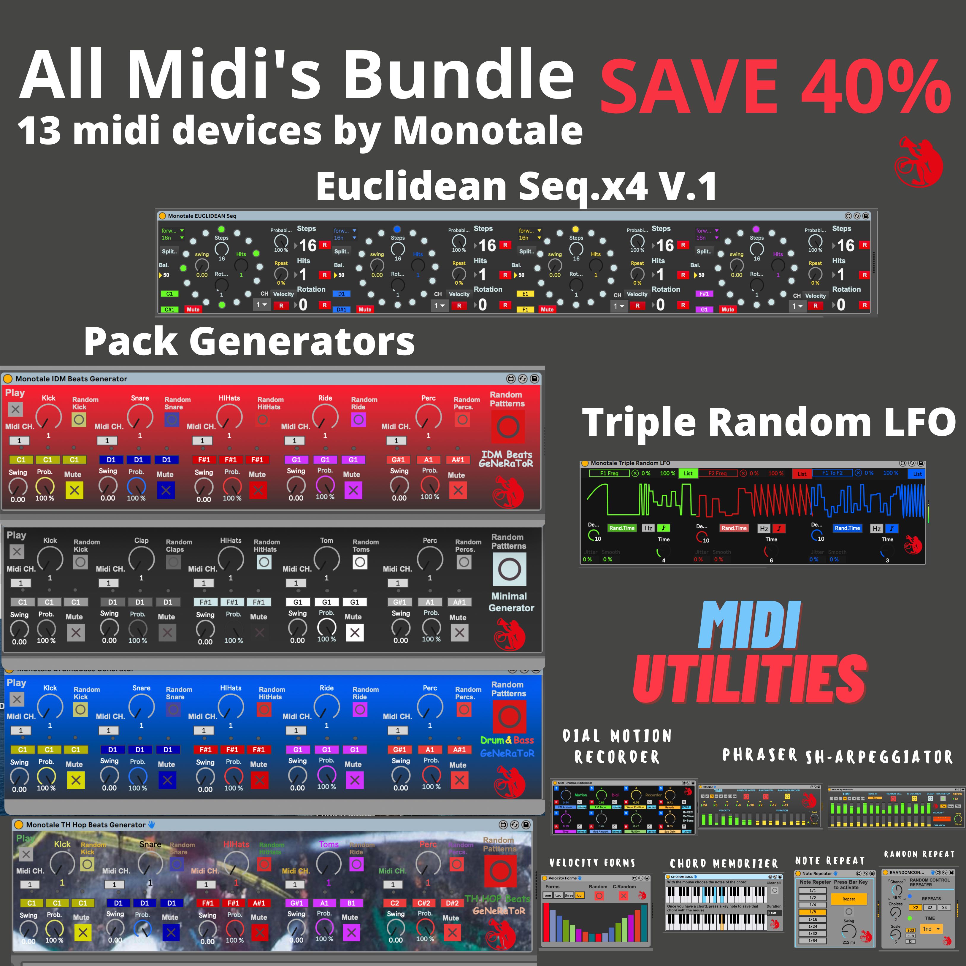 | Description: | Euclidean Sequencer x4 V.1.1 + Triple Random LFO + Pack Groove Generators (D&B, MInimal Techno, IDM and Trip Hop) + Midi Utilities + Dial Motion Recorder. SAVE 40% See List: https://www.youtube.com/watch?v=wvbM2nvtj3E&list=PLYOyhLhoXeU4QE8vnRnpJykBeFriwBOIX Buy: https://monotalefx.gumroad.com/l/pilgrs |