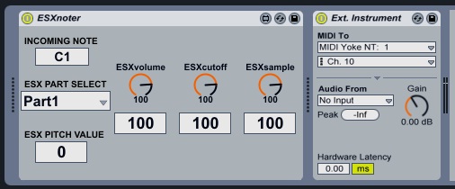 | Description: | ESXnoter is a device made for sequencing notes in Live and sending them as corresponding pitch values to the Drum Parts of the Electribe ESX sampler. The idea is to use the drum parts as keyboard parts too. This version also includes control of parameters: Cutoff, Level and Sample Select. I may add more controls in the future. There is also an ESXnoterKB for the Keyboard parts, that only send parameters control (no need for note conversion). REQUIREMENTS: On the ESX: _Your drum parts should have the MIDI notes assigned as follows (whole C2 octave): Part1 - C2 Part2 - C2# Part3 - D2 Part4 - D2# Part5 - E2 Part6A - F2 Part6B - F2# Part7A - G2 Part7B - G2# Stretch1 - A2 Stretch2 - A2# Slice - B2 _Your Drum Parts MIDI channel must be set to 10 _Your Keyboard parts MIDI channel must be set to 8 and 9. _The samples you plan to use must be tuned to C3. To achieve this you can connect the output of the ESX to the input of an audio track in Ableton Live and insert the audio effect "Spectrum". Then on the ESX go to "Sample Tune" and move the dial til you get the C3 spike on the graph of Spectrum. On your computer: Download the ESXnoter package: http://www.cooptrol.com/ESXnoter.zip You must install the following software: Ableton Live 8.2 or higher Max 5.1 or higher (the demo also works: http://cycling74.com/downloads/) MidiYoke (its free: http://www.midiox.com/zip/MidiYokeSetup.msi) MidiOX (its free: http://www.midiox.com/moxdown.htm) INSTRUCTIONS: 1) Connect the output of your MIDI interface to the MIDI input of the ESX 2) Open MidiOX, and open in it the "ESXnoter.ini" file on the package 3) In the MIDI devices configuration menu, select MidiYoke1 as input and [your MIDI interface] as output 4) Open Ableton Live and drag and drop the "ESXnoter.amxd" file on the effects section of a MIDI channel. 5) Open MIDI configuration in Live, and toggle "on" the Track output of MidiYoke1 6) Throw a "External Instruments" device to the right of the ESXnoter, and set it to trasmit to MidiYoke1 and channel 10. For Keyboard parts set it to 8 and 9 respectively. 7) Select a drum part on the ESXnoter, and play some notes or create a clip and play it. Voila! IMPORTANT: The pitch parameter has a range of 4 octaves, so you can play notes up to C5 and down to C1, higher notes will sound as C5 and lower as C1. If you need help, feel free to contact me at kooptrol @ gmail.com Enjoy! |
