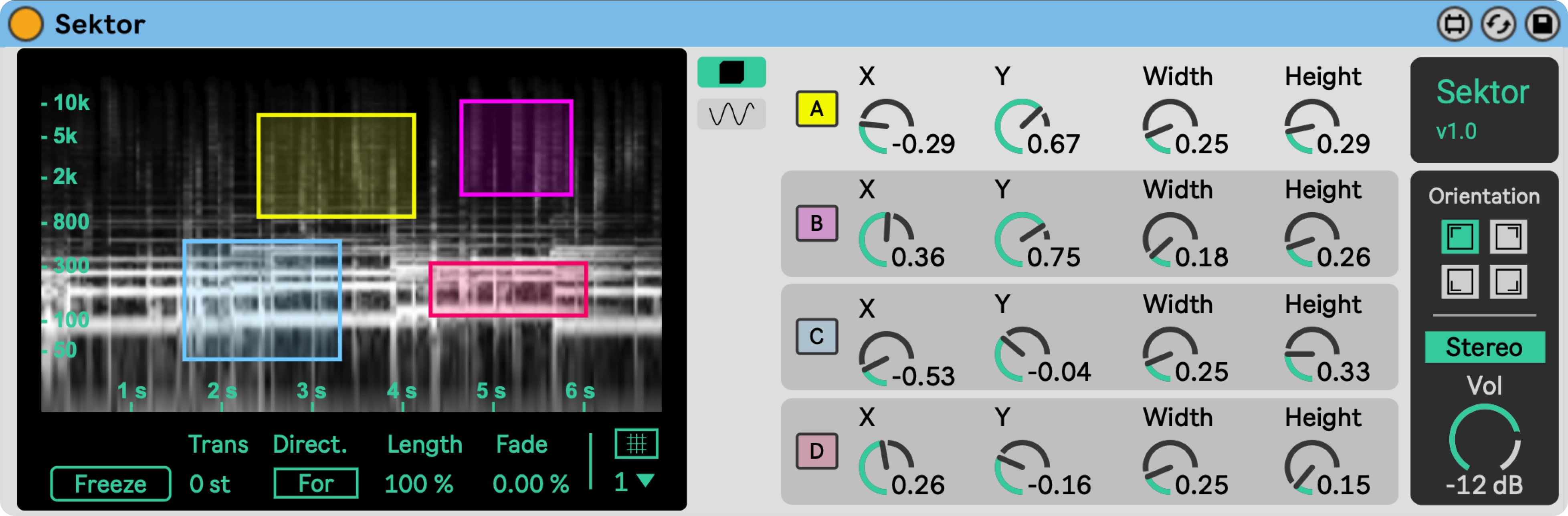 Description: | Sektor is an Max for Live insert effect for Ableton Live that uses an FFT-based frequency gate to split the incoming audio signal into up to four frequency bands. Each of the signals can be routed to individual channels in Ableton Live, where the sound can then be further shaped with effects. Further, looping and sampling functions are available to the user, allowing for in-depth audio editing and manipulation. On the scrolling spectrogram the user can draw rectangles defining frequency range and time range. This is a very accessible way to apply the sound characteristics of FFT filtering to an incoming audio signal. The powerful internal modulation system allows the size and position of the rectangles to be modulated with a wide variety of waveforms, creating exciting and unexpected sonic results. Requires at least Ableton Live 10, however Live 11 is recommended. https://www.youtube.com/watch?v=eEEuZMVexVU |
