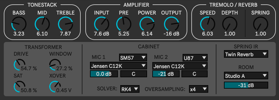 | Description: | The Fender Twin Reverb is a classic combo, but still a modern workhorse. It's bright and jangly top end is perfect for single coils strats, Rhodes, and a clean pedal platform. This is the amp sim I always wanted in Ableton. Tonestack EQ: Variations of the classic Bass/Mid/Treble Fender EQ have been copied by many different amp manufactures. Using only a handful of a passive components, this EQ's bands interact with each other when turning a single band's potentiometer. Through some circuit modelling and discretization, this was replicated using 3rd order IIR filters. Tube Amp Modelling: The tubes were modelled using fancy wavetables, developed from SPICE-like parameters. The preamp using two cascaded tube stages (12AX7 and 12AT7) and the power amp using a push-pull pair (6L6GC). Crossover distortion for the Class B power amp can be dialled in using the XOVER parameter. I used Jatin Chowdhury's implementation of the Jiles-Antherton equation to capture the saturation produced by the output transformer. My suggested workflow is dialling in the EQ first, as it can dramatically shift the overall input levels (on the real amp, the EQ was also before the preamp stage, with only a single tube buffer before it). The INPUT control can add some makeup gain if needed, and be used to drive the preamplifier. The PRE control is more-or-less level compensated, so adjusting it primarily just adjusts the distortion. The power amp follows the tremolo and spring reverb the signal chain, but I thought it made more sense to keep it together with the preamp. The POWER control drives the input to the power amp section, and the OUTPUT control can attenuate the overall amp level prior to the cabinet convolution. There isn't a dedicated gain control to adjust the level between the power amplifier output and the transformer, so it is dependant on how hard the power amplifier is being driven. The hysteresis model does include a DRIVE parameter as well, so you will should get some milage out of that if you find the hysteresis is too heavy. Optical Tremolo: BAD FENDER! This is NOT vibrato!! The tremolo in this amp uses a optical cell (Vactrol) comprised of a light emitter and a photoresistor (light-dependant resistor). In earlier vactrols, an incandescent bulb or fluorescent panel was common, leading to a longer off-time than on-time, not to mention, some crazy nonlinear curves. A triangle wave is the most common LFO shape for these circuits, and seemed to be a good starting place. Through some pulse-width skewing, and creative filtering (LPFs and logarithmic envelope followers), I was able to approximate the sinusoidal-but-off-shaped attenuation curves in these older vactrols. This undeniably adds VIBE!! :) Usage / Warnings / Bugs: In terms of analog modelling, this is the most involved DSP project I have worked on to date. Owing to this, I cannot promise it will perform perfectly. I spent several days squashing bugs on my end, and I doubt I caught everything. If you encounter any major problems, please don't hesitate to let me know - I'll do my best to fix it. Even in its current state, I notice it's not perfectly behaved - it can emit noise when first loading or changing the oversampling factor. I added a 1.5 second mute on this parameter change, but I cannot guarantee this is sufficient on all systems (different load times across different machines)... so... watch your levels! (and have your track mute button ready lol) To expand this further, I suggest adding some effects in front of the amp, such as: -ChowDSP BYOD -Echotron (from yours truly) -Ableton's Tape Echo Big thanks to the following people and resources: Guitar(ix) project - https://github.com/brummer10/guitarix/blob/master/trunk/tools/tube_transfer.py Jatin Chowdhury - https://jatinchowdhury18.medium.com/complex-nonlinearities-episode-3-hysteresis-fdeb2cd3e3f6 Schematic - https://schematicheaven.net/fenderamps/twin_reverb_ab763_schem.pdf |