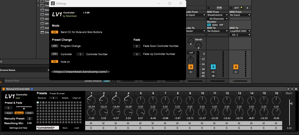 | Description: | Control 16 Channels of the Waves eMotion Mixer via Ableton Live. Store 128Presets and recall them via automation or manually. Fade between 3 presets Load Safe presets to file Control Presets via Midi or Automation Manual & Help Files I moved all support files to one facebook group (see files) you can also report bugs or questions in this group. https://www.facebook.com/groups/905896204355902 Ableton Live 12 compatible. If you want to support me play and or buy my music. The device its for free, have fun. Version History v 0.98 *** Fixed some bugs with the presets, changed the parameter names and sub channel names (should now be stable) *** Pan changed to controller numbers 70 - 85 and output 0 - 127 (7 Bit) Because there are 32 High Resolution Controllers but one pair is used by Bank Change (0,32) only 31 are left. So its not enough for 16 x Gain and 16 pan. The resolution of the Live parameter is still hi resolution to have that resolution in place if there will be an additional "protokoll" implementation eg. HUI , MCU. *** Performance Improvements Value calculation changed to native Documentation now in this document and other improvements, instead of 110 k now only *** Preset fade Works now as intended middle position is the preset. fader to the left fades to the preset - 1 fader to the right fades to preset + 1 *** Presets Count Now 128 Presets are available *** Main Main Gain added to the preset *** Midi Controller Preset Change via CC, Program Change Note On Fade via two controller Fade Up / Fade Down *** Push Controller support |