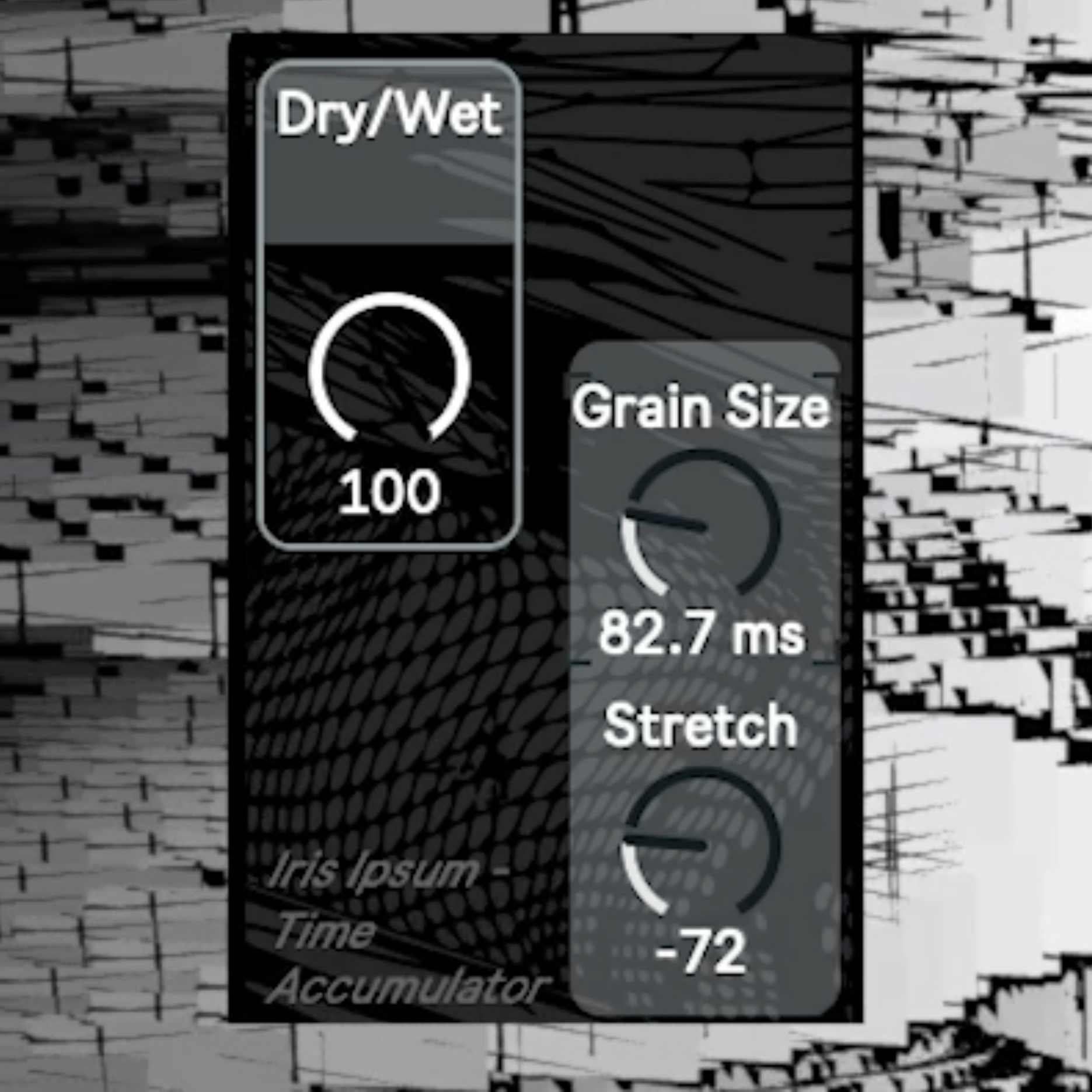 | Description: | Time Accumulator is a new free real-time audio stretch and granulator max for live effect plugin. The grain size parameter determines the length of frozen segments of audio, and the stretch parameter determines how quickly the recorded buffer is moved through. Note: the device has quite a bit of latency between the incoming signal and what is reproduced, and moving the stretch parameter will reset the buffer, causing the device to output the unprocessed signal. If there is continuous automation on the stretch parameter, the device will output unprocessed audio. If there are any issues don't hesitate to contact me :) |