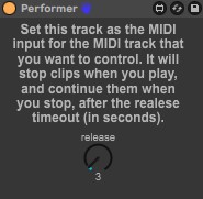 | Description: | Are you an Ableton Live user that wants to play multiple MIDI controllers during the performance, but you cannot combine the live performance and the MIDI tracks playing the recorded clips? Performer is an Ableton M4L device that enables you to do it! Create a new MIDI track, drop the Performer.amxd to it, set its Monitor to "In" and choose the MIDI controller from the "MIDI From" drop list. Then choose that new MIDI track as the "MIDI From" source for the track that you want to control. When you start playing on your MIDI controller, controlled track's Monitor will switch from "Auto" to "In" automatically, which will temporary mute the playing clips, and let your performance be heard. When you stop playing, after the configurable release timeout (3 seconds by default) the track will switch back to "Auto" and playing clips will unmute. Set up as many controllers as you like and make your performance intuitive and convenient! Works on Ableton Live version 10 and later. Currently free, with optional payment. |
