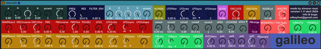 | Description: | I wanted a 69 knobs synth, so I made it. Right now it's called GALILEO because once you've mapped it, you can aim for the stars, but feel free to name it like your dog or suggest me a better name. GALILEO has 3 oscillators: 2 sound sources with 4 basic shapes (sine, saw, square, triangle) and a noise channel with its own independent ADSR. The noise goes through a key-tracked band pass filter, so you can crank up the resonance and play the noise as a third sine wave oscillator. You can do FM to the sine and saw wave, and PWM to the square and the triangle. GALILEO is mono, it's poly (16 voices), it has a juicy 303-style low pass filter (courtesy of BEAP) with its own LFO and ADSR, it has a high pass filter, a pitch envelope, it does tremolo, vibrato and glide (the glide module is also courtesy of BEAP). I programmed it all by myself in one month, and one month ago I had never programmed anything in my life (I'm a street musician). I wasn't able to give keytrack to the low pass filter and this thing is killing me, and also I don't understand why it's taking up so much CPU: I understand it has a lot of oscillators and LFOs, but seing the amazing and light-weight stuff people put out, I'm feeling I'm missing something. So, once again, any suggestion / feedback is super welcome: I'm positive I've made some mistakes, but I've been playing this thing for the past few weeks and it's giving me so much joy that I needed to put it out there. GALILEO is free to download but on account of my line of work I will gladly take your money. http://paypal.me/jingledjango FEEDBACK/SUGGESTIONS/INSULTS silkeyfoot@gmail.com |