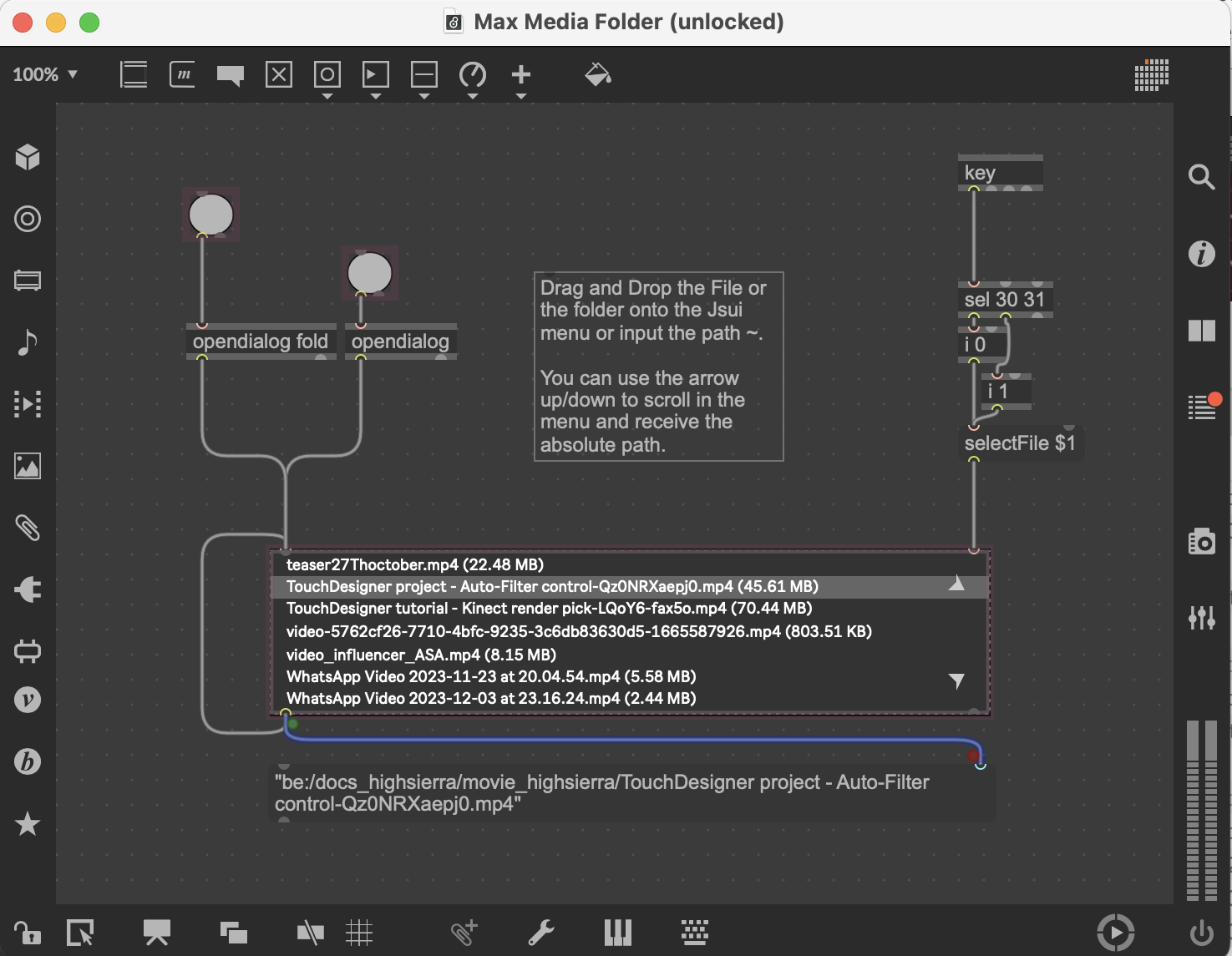 | Description: | This Jsui script allows you to navigate a selected folder media, with a an expanded view of the files and relative byte size. Drag and Drop the File or a folder onto the Jsui menu or input the path ~, there are two opendialog that will help with the browsing. You can use the keyboard arrow up/down to scroll in the menu and receive the absolute path. I use it as part of a process chain of two major projects and have extra control over my files system. |