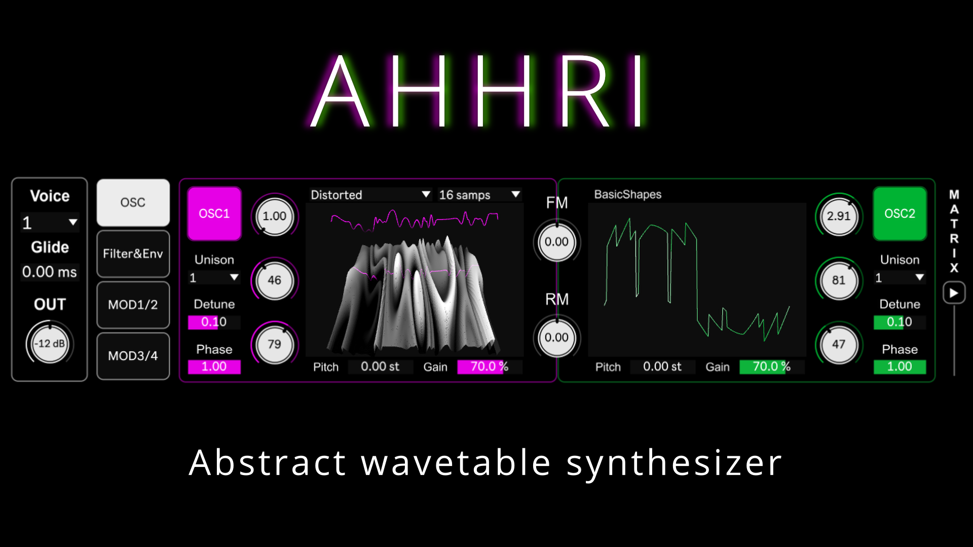 | Description: | AHHRI - Abstract wavetable synthesizer ↓↓Sound demo↓↓ https://youtu.be/0YcYDSiCr9I Unlike typical wavetable synthesizers that use a single knob, this device has three knobs to deform the wavetable. Each of the 128 wavetable positions has 128 variations, allowing the user to move freely between these 16384 wavetables. And these 16384 wavetables are not mathematical variations, but the wavetables with unpredictable organic variations. This allows you to create your own unique sound with more individuality and variety. Four modulations can also be used to create unique sounds which have more complex movements. I hope this device will give you more imagination and inspirations! //Create the sound with ・2 oscillators ・1 filter (hp,bp,lp) ・Amp envelope ・Polyphonic modulation with 4 mod sources and matrix SNS https://twitter.com/anri_k_0620 https://www.instagram.com/anri_kunitake/ ©2024 Anri Kunitake |
