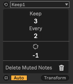 | Description: | 1.2-UI tweak/ Added ability for both the "Keep" and "Every" amount to be variable. You can now Keep ? Every ? 1.1- Added the ability to delete the muted notes, if you delete the muted notes you'll need to click in the clip anywhere to commit the change and end the current apply cycle. Keep1 is super simple, it'll keep 1 out of every nth note and let you rotate which note is kept, all other notes are muted so it's nondestructive and can be changed at any point. I was doing this by hand or with midi effects to split sequences between tracks and wanted a simple and quick way to do it. Maybe someone else will find it useful also. |