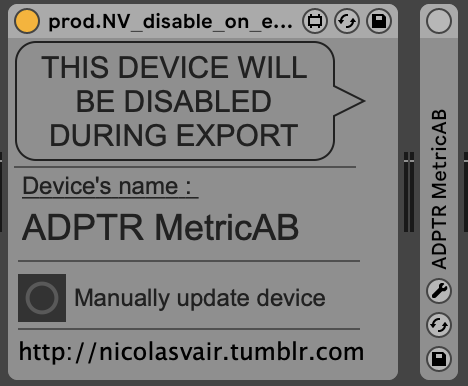 | Description: | Simple device to disable a plugin during export. It works with groups too. Collaboration is welcome but the device is available for free. No need to put a real email. Note : Because it was unreliable to detect export fast enough, the tricks I use is to disable the device and enable it only during playback (checking first if it's not in export mode). It is working great this way. Find my other devices here https://nicolasvair.tumblr.com/post/733477909092810752/max-4-live-devices |