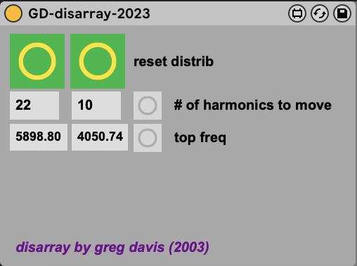 gd-disarray is a Max For Live device that I originally created in the Max/MSP Pluggo environment around 2003 & updated for M4L in 2023. It is a spectral scrambler of sorts. You can choose how many harmonics you’d like to move (or rearrange) as well as the maximum frequency range. There are buttons to randomize both values as well as reset the distribution of the harmonics. |