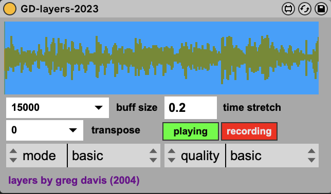 gd-layers is a Max For Live device that I originally created in the Max/MSP Pluggo environment around 2004 & updated for M4L in 2023. This is another variation of my “real-time” time stretching effects. This one seems to have a smoother characteristic. You can set the amount / speed of time stretching, buffer size that the incoming audio is recorded into & transposition (pitch in cents). And some other fine tuning. |