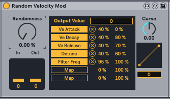 | Description: | Use velocity to modulate up to 7 sources. Also comes with a curve control. Very simple first device I've made. Quite similar to Expression Control but with a 0-100% randomisation knob and limited to Velocity. I made this device to specifically be used with Simpler and Sampler for more expressive / natural drums by linking the velocity to Attack, Decay, Detune, Filter etc! Updated to version 1.1: - Updated to correct the issue where the mapping section was not showing for users. - Updated to correctly show background colours on different Live Themes. Please email me at nahmama808@gmail.com with any other issues or bugs! |
