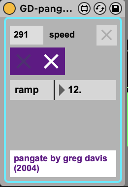 gd-pangate is a Max For Live device that I originally created in the Max/MSP Pluggo environment around 2004 & updated for M4L in 2024. It is a simple hard panning / gate effect, alternating left and right. You can set the speed of the pan and the ramp time. The toggle in the upper right corner turns on some randomization for weirder panning. This is a simple plugin so its free or PWYC. |