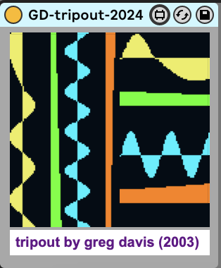 gd-tripout is is a Max For Live device that I originally created in the Max/MSP Pluggo environment around 2003 & updated for M4L in 2024. This makes the incoming audio super twisted. Gliding pitches, panning and fading in & out. No controls on this one! |
