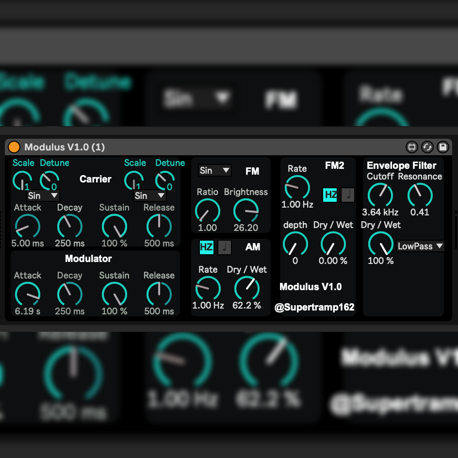 | Description: | Modulus is a versatile polyphonic synthesizer designed for Ableton Live, offering a rich palette of sound design possibilities. With multiple selectable waveforms, you can shape your sound with precision, exploring both traditional and experimental tones. Modulus features advanced frequency and amplitude modulation capabilities, allowing you to craft dynamic and evolving sounds. The integrated envelope filter adds another layer of control, shaping the attack, decay, sustain, and release of your sound with finesse. What sets Modulus apart is its flexible modulation options. Both the frequency and amplitude modulations can be independently set to as an LFO frequency rate or synced to Ableton Live's tempo, giving you the power to create rhythmically complex patterns or fluid, free-running modulations. Whether you’re crafting deep basses, lush pads, or intricate leads, Modulus delivers a robust toolset for the modern producer. If you like my work and wish to collaborate or contact me, the best place to do so is through my instagram @supertramp162 |