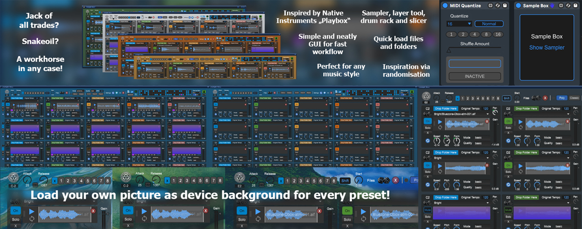 | Description: | Sample Box is inspired from Native Instruments "Playbox", where you can create sample layers and play them as (MIDI) chords. A great device, but unfortunately it's not very beginner friendly and the file import system is quite awkward in my opinion. Sample Box is a workhorse and offers a wide range of creative possibilities. It's a compact sample player instrument, layer tool, drum rack and slicer, all in one. It also feels a little like playing scene clips in Live's session view. Sample Box allows you to see all parameters at a glance, without annoying tabs or clicking actions. It allows you to quickly load and replace files or folders within seconds. With the including Device "MIDI Quantize" you can quantize your MIDI input, which can be very handy for recording percussive stuff and live performance. (The credit goes to nonagon's "Real-time MIDI Quantize". Thank you for this great free device! I just optimized the GUI a bit.) Because all audio files and parameters are visible at a glance, it is much easier to adjust individual parameters in context without losing sight of the whole picture. It feels more compact. THE DEVICE WORKS AS FOLLOWS: You have 5 MIDI notes (by default C2-G2), that can be easily played with one hand. Each MIDI note triggers a layer of up to 4 audio files (playlists). You can adjust start and loop points, volume, pan, speed, pitch, formant, warp mode, quality and tempo for each layer individually. The device is great for sound design and resampling. Just drop some sample folders and hit "randomize" to get new sample combinations and new inspiration. You can create long evolving, organic textures, lush drum hits or even complex chord progressions. You can use it as regular MIDI Drum Rack to create beats or even whole tracks. As always all important parameters are mappable. MAIN FEATURES: - Trigger up to 5 layers with up to 4 samples / playlist - Swap and randomize samples or folders within seconds - Polyphonic, monophonic, classic and one-shot mode - Inclusive Live MIDI Quantizer with shuffle function - A simple and neatly GUI for a fast creative workflow - An appealing and uncluttered exterior with skin presets - Load and save your own pictures as device background |