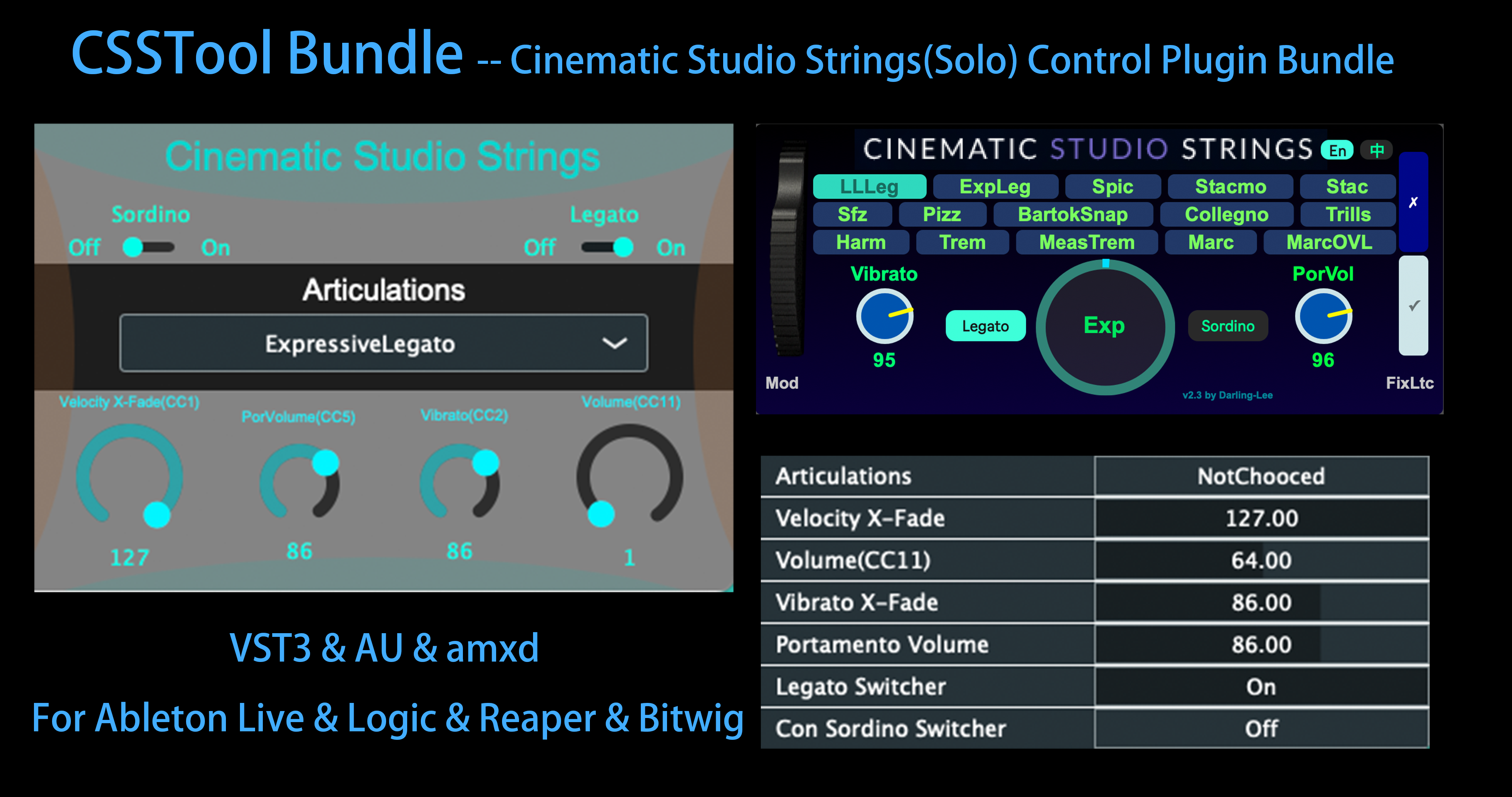 | Description: | This is a plugin for Cinematic Studio String/Cinematic Studio Strings Solo, with articulations control, latency issue fix, volume (CC11), vibrato X-Fade (CC2), portamento volume (CC5), and velocity X-Fade(CC1) control functions. It includes two plugins, one is CSSTool, and the other is 330msCompensator (providing 330ms delay compensation for tracks), where: @AUv2: for Logic @VST3: for Reaper/Bitwig Studio @amxd: Max for Live plugin for Ableton Live (no manual track delay setting required, hence no 330msCompensator plugin) Features: 1. Use track automation to fully control the articulations, volume expression (CC11), vibrato X-Fade (CC2), portamento volume (CC5), and velocity X-Fade (CC1) of Cinematic Studio String/Cinematic Studio Strings Solo. 2. Automatically fix the latency issue of Cinematic Studio String/Cinematic Studio Strings Solo, so you no longer need to worry about its sounding latency problems and can directly input notes aligned to the piano roll grid. 3. Multi-format support, including universal VST3 and AU versions for MacOS, VST3 for Windows, and M4L version for use in Ableton Live. Supports Ableton Live/Logic/Reaper/Bitwig Studio (other DAWs do not currently support third-party MIDI effects). 这是一个用于Cinematic Studio String/Cinematic Studio Strings Solo的插件,具有演奏技法控制,延迟修复,音量(CC11),揉弦(CC2),滑音音量(CC5)和CC1控制功能,它包含两个插件,一个是CSSTool,另一个是330msCompensator(为轨道提供330毫秒延迟补偿),其中: @AUv2:用于Logic @VST3:用于Reaper/Bitwig Studio @amxd:用于Ableton Live的Max for Live插件(无需手动设置轨道延迟,因此无330msCompensator插件) 特点: 1. 使用轨道自动化完全控制Cinematic Studio String/Cinematic Studio Strings Solo的演奏技法,音量表情 (CC11), vibrato X-Fade (CC2), portamento volume (CC5), 和velocity X-Fade(CC1); 2. 自动修复Cinematic Studio String/Cinematic Studio Strings Solo的延迟问题,您不再需要考虑它的延迟问题,可以直接对齐钢琴卷帘的网格写入音符; 3. 多格式,包含双架构通用的MacOS的VST3和AU,Windows的VST3以及Ableton live上使用的M4L版本。支持Ableton live/Logic/Reaper/Bitwig Studio(其他DAW暂不支持第三方MIDI效果器)。 |
