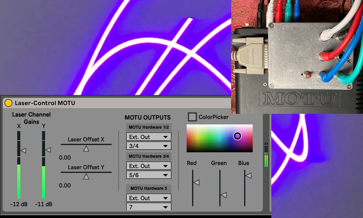 | Description: | This Max for Live Device simplifies the process for getting a set-up going to run an RGB laser from within Ableton Live. By default it assumes a MOTU UltraLite MK3 is attached via USB, and that an ILDA breakout box is connected using MOTU hardware ports 1-5. Build your own breakout box using the included PDF, or purchase one, but I cannot provide support for the hardware. The device can be loaded on any audio track, Send track, or even the Master. I tend to use a Send track, and put the µScope audio visualizer device (listed elsewhere on MaxForLive site) on another Send track. That way one can see what the Laser should be outputting. You can probably use some other multi-channel soundcards but I have only tested it with the MOTU Ultralite MK3 Hybrid. It has fully automatable controls for Red, Green and Blue levels, X and Y levels, and X and Y offsets. It allows for manual control (on-screen or via MIDI) of those parameters, and also lets one randomize the color values of the lasers. The device saves it's settings with the Live Set. I have included another PDF that gives some insight into which frequencies and waveforms generate which shapes. You might want to use the Laser Oscillators Max for Live Device (listed elsewhere on MaxForLive site) for exploring those shapes. There is a video showing an example of how the tools might be used on the GumRoad site. NOTE: MOTU Channel Numbering Scheme in Ableton MOTU's numbering goes Main Out 1, Main Out 2, Output 1, Output 2, Output 3, ... Output 8. Live's numbering is just Out 1, 2, 3, 4, 5, 6... etc... One thing to watch out for, is that the channels in Live don't correspond with the labelling on the Ultralite. On the Live outputs, channels 1 & 2 are mapped to the Ultralite's Main Out 1 & 2 (and/or Headphones). Which means channels 3 & 4 in Live correspond with MOTU output 1 & 2 (as labelled on the back of the Ultralite). Those outputs go to the X and Y jacks on the Laser breakout box. Channels 5 & 6 in Live correspond to MOTU outputs 3 & 4 (as labelled on the back of the MOTU) and will connect to the Red and Green connectors to the Laser. Finally, Channel 7 in Live corresponds to output 5 on the back of the MOTU and connects to the Blue Laser connection via the breakout box. |