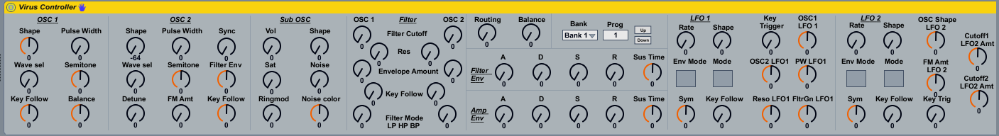 | Description: | Max4Live control for the Access Virus C Synth Virus Controller uses CC messages to control the synth parameters in real time. I have included all midi parameters from the Virus C manual including the effects section of the synth in Single patch mode. Also included are Bank / Program selection menus. Program selection has been limited to program values at the moment. I hope to include program names, in addition to Multi-Mode control the next version. Feedback or feature requests would be appreciated. |