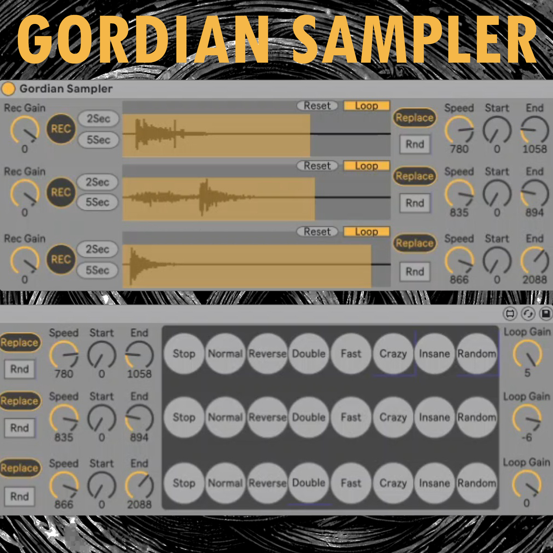 | Description: | Gordian Sampler Max for Live Device #ableton download: https://www.remodevicocomposer.eu/maxforlive/maxforlive4/ programmed by Remo De Vico, Massimo Palermo Gordian Sampler: How to Use 1. Recording and Gain Control. Each of the three channels has an independent Rec Gain knob to control the recording input level. Choose between 2Sec or 5Sec for quick recording durations. Press the REC button to capture audio. 2. Waveform Display. After recording, you’ll see the audio waveform displayed for each channel. This visual representation helps you to identify and precisely manipulate your sample. 3. Replace Function. Click the Replace button to load an external sample directly into each channel. This lets you experiment with pre-recorded sounds and combine them with recorded audio. 4. Loop and Reset Functions. Use the Loop button to continuously play the sample as a loop. The Reset button reverts the settings to their original state for easy adjustments and experimentation. 5. Speed, Start, and End Controls. Speed: Adjusts the speed specifically for Random Mode, allowing for varied playback tempos. Try using different speeds to create rhythmic pads or atmospheric textures. Start and End knobs let you set precise start and end points within the sample, tailoring playback to specific sections. 6. Sample Manipulation Modes. The various mode buttons allow for creative manipulations of each sample: Stop/Normal/Reverse/Double/Fast/Crazy/Insane/Random 7. Randomize Position with Rnd Button. The Rnd (Randomize) button changes the sample playback position, introducing unexpected shifts within the sound. Perfect for adding variation and surprise elements to your loops. 8. Loop Gain Control. Each channel has its own Loop Gain knob to adjust the output volume independently, allowing for precise control over the mix of layered sounds. The "Hidden Bug". Load a sample that is longer than the default recording time. Click on REC to start recording again. When you do this, the recorder will allow you to capture for the length of the loaded sample, effectively extending your recording time! Have Fun! check out my music https://remodevico.bandcamp.com/ or https://www.remodevicocomposer.eu/ |