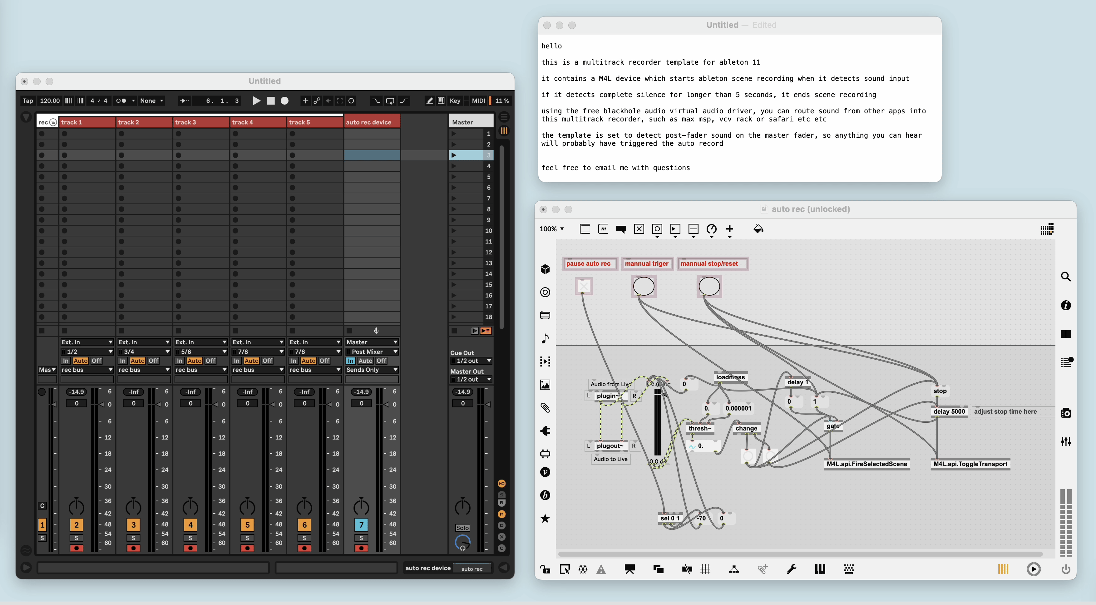 | Description: | this is a multitrack recorder template for ableton 11.3.1 suite or newer it contains a M4L device which starts ableton scene recording when it detects sound input if it detects complete silence for longer than 5 seconds, it ends scene recording using the free blackhole audio virtual audio driver, you can route sound from other apps into this multitrack recorder, such as max msp, vcv rack or safari etc etc the template is set to detect post-fader sound on the master fader, but you can change it to listen out for any signal provided you send it to the track input where the device is here is a demo: https://www.youtube.com/watch?v=sbQ7gAIRefQ it's a simple tool, but no one else had made one so someone might find it useful feel free to email me with questions - seraphimblush@gmail.com if you like it you can donate via paypal - paypal.me/seraphimblush or donate via gumroad - https://seraphimblush.gumroad.com/l/abletonmultitrackautorecorder or follow me on instagram - https://www.instagram.com/seraphim_blush/ |