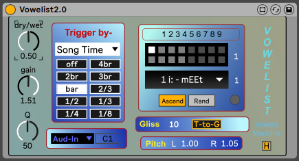 | Description: | About the ‘Vowelist’ plugin and how to work with it - 'Vowelist' – is an amazing tool to make any of audio source be shaped or sculptured to human vowels and sounds like it talks! An Ableton plugin for PC and Mac that is actually emphasizes the right frequencies to create each vowel (Formants). ( In this new version you can call Midi to trigger Vowels from any where on your set - Live 11 only ) - Use the Useful hints (triggered by the 'H' button), the documentation at the info view Live window for each button and feature and the ReadMe file (click the icon). In the device- There are 9 vowels in a menu bar. Use the text box, where you enter numbers that represent vowels. After building a vowels list, save it as a sequence on the preset board. Saving presets on Pc: Shift + left click on a slot, add Alt to delete a preset from slot. Saving presets On Mac: CMD + Shift + left click Add Option to delete. When vowels triggered, they called from a certain saved list(preset). The 'Vowelist' is not a synthesizer – it needs an audio source to ‘sculpture’ its sound to vowels. The more the audio source is rich with harmonics – Distortion/Drive, White noise, Saw/Square/Triangle waveforms- the more cool and significant the output is! Vowels can be triggered and change by 4 methods (only one at a time)- 1. Midi - by incoming Midi from any where on your set. (See farther menu after chosen) Midi from different tracks - only on Live 11 or newest. 2. Song Time - by Live's current song count and with its relative meters. 3. Attack Detection - by any coming audio-in envelope's Attack. 4. Inner Metro - by device's independent inner metronome. you can change B.p.m as well as using the random rhythmic phrases. 5. Slide - by sliding manually and transit between vowels (number box or mapped Controller). Browse to the next vowel with the vowel number box(right-red). Use the verity of features like the Glissando parameter with its modes, the Left and Right Frequency Shifter for low or high texture and a panoramic sound, the inner basic Synthes and many others! Made with Max For Live by Zion Bublil, 2022 Full support at - ziob06@gmail.com |