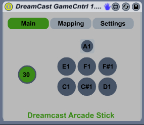 | Description: | DreamCast GameCntrl is a device built to allow HID2Midi conversion especially for the Dreamcast Arcade Stick (But not only): http://upload.wikimedia.org/wikipedia/commons/6/69/Dreamcast_ArcadeStick.jpg The 7 Buttons sends midi notes arranged by a logical visual way to the drum racks and the Joystick sends CC30. If you have the EMS TrioLinker Plus II (Dreamcast to USB converter) it will automatically lock and you can start playing, if you don't own the EMS TrioLinker simply choose your HID device from the Drop down Menu under the Settings tab. If you wish to map any of the buttons or the joystick to control something in Live simply create a new midi track, set the 'Midi From' to the track the DreamCast GameCntlr is on, set 'Midi To' to One of the virtual midi drivers (IAC on Mac, Midi Yoke on PC) and put the tracks's monitor on IN. Note: Make sure the Track and Remote are turned on in Ableton's Midi preferences. The Dreamcast Arcade Stick in action: - http://www.youtube.com/watch?v=QMXJzBp1Kxs - http://www.youtube.com/watch?v=Pf1ZkV8pbo8 - http://www.youtube.com/watch?v=Y3-zOt7yMDY - http://www.youtube.com/watch?v=V4PV-FQoDuE Change log: *1.01* Added UI menu Added the ability to change the midi note for each button |