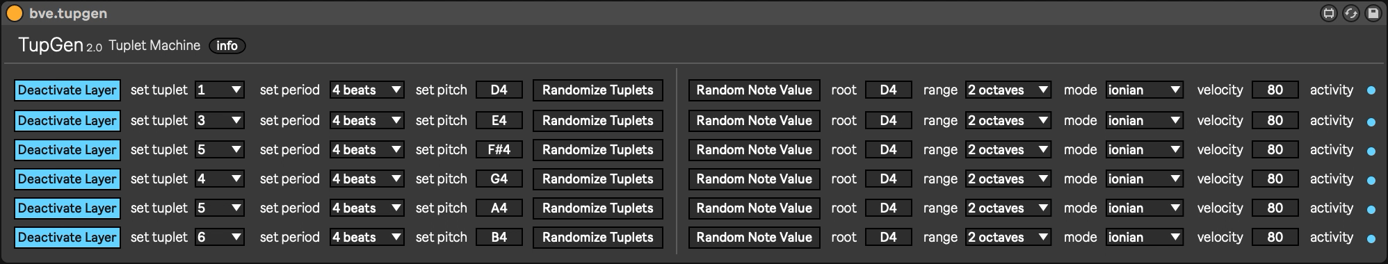 | Description: | TupGen is a euclidean sequencer. 6 layers, slaved to Live's transport, can be configured separately to spit out up to 16 different kind of tuplets (each), which take place over an adjustable amount of beats. TupGen is a great tool for composing irregular beat patterns. For live usage, all parameters have been made mappable. |