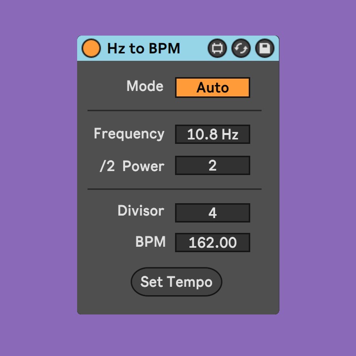 | Description: | Hz to BPM converts a frequency Hz value to a Beats Per Minute value and updates the tempo of the Live set. BPM results that are out of range can be scaled down to a usable tempo range while maintaining relationship to the original frequency. Use "Mode" to determine how the current Live sets tempo will be updated, "Manual" requires the Set Tempo button to be clicked. Selecting "Auto" updates the tempo on each calculation if result is within valid tempo range. Use the "Frequency" box to select the frequency to be converted. Selecting a value other than 0 in the "/2 Power" box will divide the result by 2 to the power of the selected value, in other words the result is halved that many times to get the final BPM. This automatically updates the Divisor box which tells us how many times the result is divided explicitly. Please consider downloading and donating via Gumroad to support development. https://ultradian7.gumroad.com/l/hz-to-bpm-m4l |