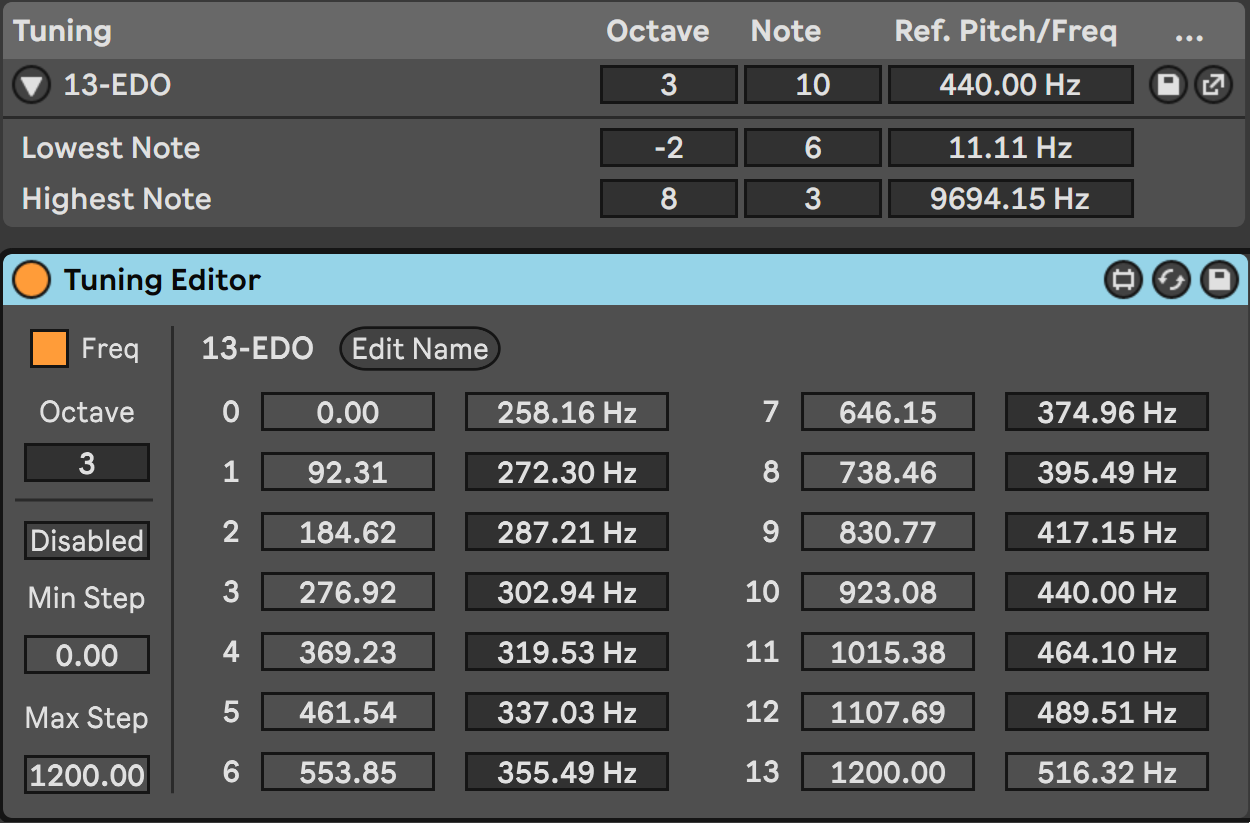 | Description: | Edit the Live sets native tuning system steps in real-time. Key features: - Modify tuning steps for the Live set. - Update tuning system in real-time. - Display note frequencies in Hz for each octave. - Optionally set tuning steps by frequency. - Rename the tuning. - Export tuning as .ascl in Live. Note frequency Hz values are displayed per octave alongside steps. Min and max step cents range are adjustable, min can be set to a negative value. The max range is 1200 cents by default unless a tuning is loaded with a higher step value, then the highest step value will be set as the maximum. Current limitations of the Live API mean that the last step, or 'pseudo octave' cannot be modified and maintains it's value from the loaded tuning file. The first step is always 0.00 cents as per the .ascl specification. Refer to https://tuning.ableton.com/make-your-own-tuning/ on creating your own tuning .ascl file. You could create a tuning with the tools on Ableton's page, then use our Tuning Editor to tweak the steps in real-time while using Live's instruments, or play and tweak with the tunings bundled with Live to something that feels right to you. This device was made with the Live 30 day trial, no further updates are possible until I acquire a Max For Live license. Relying on donations to support this, if you use the tool and would like to see it developed further please support us! Thank you :) *Update, we now have another 30 days thank you to Ableton! https://ultradian7.gumroad.com/l/tuning-editor-m4l |