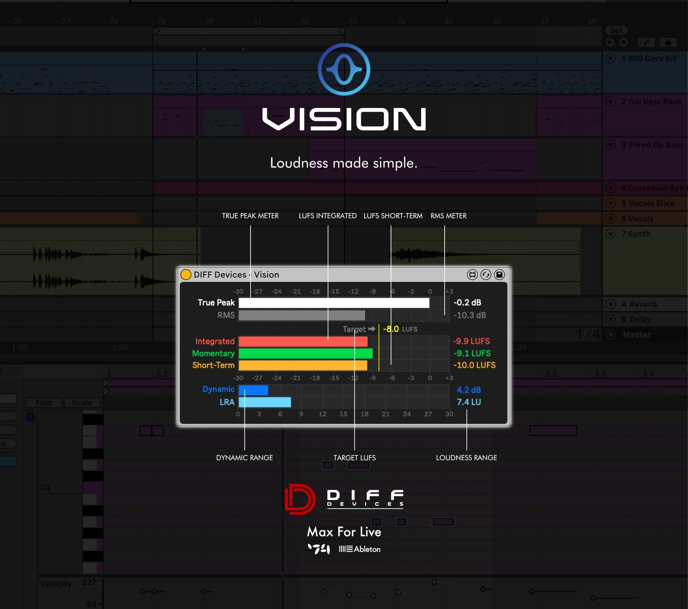 | Description: | DIFF Devices - VISION is the ultimate loudness monitoring solution for audio professionals. Featuring precise True Peak, RMS, and LUFS measurements, it delivers real-time feedback to help you craft perfectly balanced mixes. With integrated monitoring for momentary, short-term, and integrated loudness, VISION ensures your audio meets industry standards with ease. Its sleek, intuitive design provides unmatched clarity, empowering you to achieve optimal dynamics and consistent playback across any platform. Whether you're in the studio or on stage, VISION is your key to mastering sound with precision and confidence. FEATURES 1.1: • True Peak Meter • RMS Meter • LUFS Integrated • LUFS Momentary • LUFS Short-Term • Loudness Range •Dynamic Range • Target LUFS Inside the zip file you have an file : 1. DIFF Devices - VISION.amxd 2. Save the .amxd file anywhere on your computer or in a folder that you previously saved your maxforlive devices. 3. Drag and drop the device into a midi track. 4. Click on save (on the right hand side of the window: with a 'floppy disk' icon)... (Check Manual.) 5. This will automatically save the device to your ‘User Library’ folder in ‘Places’ (the ‘head outline’ icon), and will also save a '.adv' file which can be used to store your favourite initial setup. 6. You’re good to go. SYSTEM REQUIREMENTS • MAC & WIN * Only works in Ableton Live with Max installed. * It Requires Ableton Live V12 (minimum). * M1 Mac Compatible. |