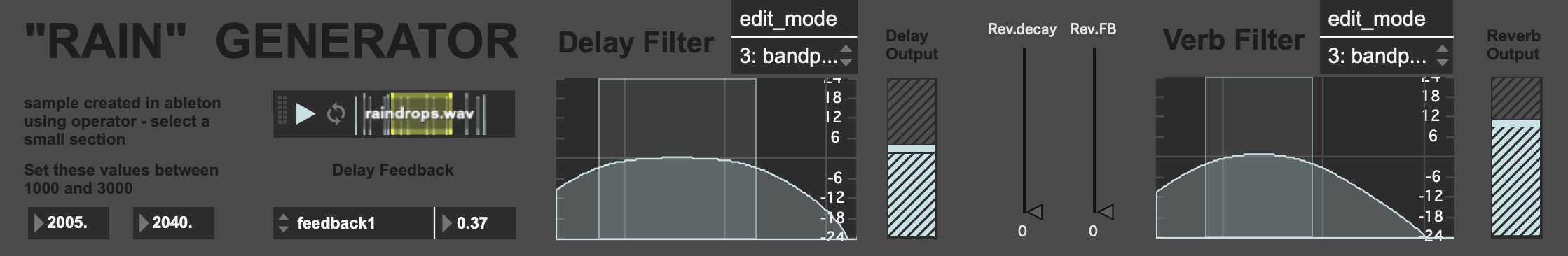 | Description: | The Rain Generator patch was created by Josiah Simonds, Rudik Mkrtchyan, and Sena Feldman. With assistance from Tamas Marqutant. It was created for an Academic project at Catalyst Institute for Creative Arts and Technology and is not intended for sale. You can control The Increment deviation, feedback, filter and output of the Multichannel delay line, as well as the Decay, Feedback, Filter, and output of the Reverb. The concept of this patch was to simulate the sound of rain using maxmsp. there is still plenty of room for improvement, but we hope you enjoy! |