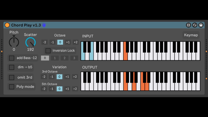 | Description: | This is a device for playing chords in an easy and intuitive way using only 2 octave or higher MIDI keys. You can pursue the sound of chords at will, distancing yourself a little from music theory. The left hand selects the chord and the right hand plays the note. https://x.com/loop_construct/status/1885744924831953255 You can play various kinds of chords by pressing a major key (C2) or a minor key (C#2) and another key at the same time. For example: C2+D2=major7 , C#2+D#2=minor7 , D#2+G2=7sus4 , C2+D2+F2=major9th – C2 to B2 are chord selection keys, which can be changed in the keymap window. – Three chord of any configuration can be added. – The inversion key allows temporary inversion. – Increasing the value of scatter will randomly delay the start of the note. --Keymap-- C2 = major C#2 = minor D2 = add major7 D#2 = add minor7 E2 = add 6 F2 = add 9 F#2 = inversion1 G2 = sus4 G#2 = inversion2 A2 = dim (Switchable to ♭5) A#2 = inversion3 B2 = aug --------------------------------------------------- 2/1 Update: – Mono and poly toggle button 2/6 Update: – Fixed a bug that caused loss of note-off signal when entering notes that were too short. – Adjustments were made to the Scatter. – sus4,dim,aug can now play second and third notes without pressing the major key. – Three chords of any configuration can now be added. 2/8 Update: – Added 3rd & 5th variation buttons. – Changed GUI layout. – Fixed a bug that caused wrong midi signals to be sent when the polymode button was pressed after startup. |