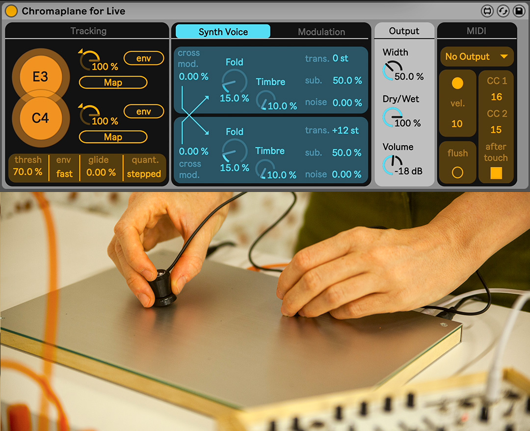 | Description: | Control external synths and Ableton instruments using the Chromaplane! This is a Max for Live audio device that converts audio from the Chromaplane's pickups into a duophonic digital synth voice. It can also route a MIDI translation of the detected pitches to your MIDI tracks in live. To set it up, plug your Chromaplane's pickups directly into your audio interface, then select them as the stereo audio input for the Max for Live device's channel. What's the Chromaplane? It's is an instrument created in collaboration between KOMA Elektronik & Passepartout Duo. It's played using two electromagnetic pickup coils, that are moved over its surface to listen to a cloud of electromagnetic fields produced by the instrument. Help getting started with the device can be found here: https://chromaplane.co/max-for-live/ Bugs or issues? Tell us and we will try to fix it! passepartoutduo@gmail.com |