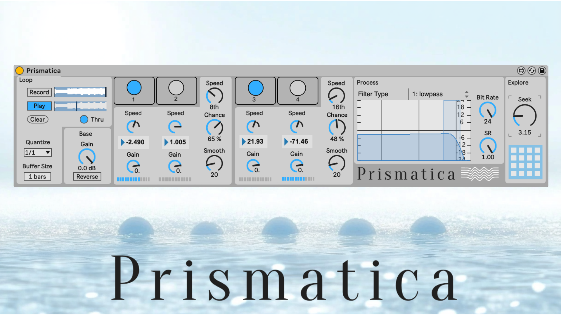 | Description: | Prismatica is something a bit different. The easiest way to describe it is an arpeggiator for audio. The heart of Prismatica is a looper which then sends your loop to four more loopers, grouped in two pairs. Each of these four loopers has a speed control, so you can adjust the pitch of each loop (1x is normal speed, 2x is double speed, 0.5x is half-speed, -1x is reverse, etc). But rather than play all four of these loops at once, we have some logic within each group to determine which loop is played. There's a speed control and a chance control for each of these pairs of loops. The chance dial controls the likelihood of a switch to the other loop and the speed dial controls how often this decision is made. A speed setting of 16th notes and a chance setting of 100% means you will flicker between loops A and B every 16th note. Set the chance down to 25% and there's only a 1 in 4 chance that the loop will change, etc. It maybe sounds more complicated than it really is. I think the video will show you exactly what I mean. There's also a unique preset system in Prismatica. The four loops' speed settings are stored as presets and there's a Seek knob that allows us to smoothly interpolate between these values, providing very interesting results. I think there's a lot of potential here both for sound design and just ambient exploration. I feel this is a somewhat unique idea and I do recommend you watch the video to see exactly how it works. I hope it brings you some inspiration. As always, I appreciate you for even reading this far and for the past support of my other devices. I'm a stay-at-home dad to a very cool toddler and your support is what makes this life possible for me - and I love it. Video walkthrough here: https://youtu.be/BYApv3Bon2g Change Log: v1.1 - I've just released a new update that allows you to save and load loops back into Prismatica. This was inspired by a Youtube comment, noting that when you close your project and re-open it, the audio recorded into Prismatica does not remain. This is true and unfortunately a bit of a drawback with Max4Live or at least the way I'm doing things, but hopefully this update is useful for you! There's a video walking you through the new update here: https://youtu.be/zpufnugb5FA v1.2 - Fixed a bug introduced in v1.1 where if loading a loop via the Load button, it wouldn't play out of playheads 3 & 4. Also fixed the Base Gain dial - upon loading the device it would show as being turned all the way down but the Base audio would still play. v1.3 - Major update featuring requests from users of Prismatica! Multi outs - You can now send each looper to a different audio track in Live and pan and effect them individually Clearer and more musical pitch selection - added more musical intervals as well as labels to describe each one (ie: + m 5th, + 2 Oct, - M 7th, etc) without the user having to do math to find musical intervals Explore panel - Seek has been renamed to Morph to better describe what it does and I've also added a Jump dial to snap from one preset to the next, instead of slowly interpolating between the two Fixed small issue where the four loopers' gain knobs were not displaying their full dB value Changes to automation - removed some duplicate properties which did not need to be recording automation in Live Video walkthrough of these changes here: https://youtu.be/tPwsN3-Tsac v1.31 - Fixed a couple of the colors of the background panels - they were inadvertently changing depending on the theme the user is using. v1.32 - Changed the behaviour of Prismatica when playback is stopped via Ableton Live's transport panel (ie: playback stopped). Now, all Prismatica's loopers will also stop when this happens and will restart when playback is restarted. |