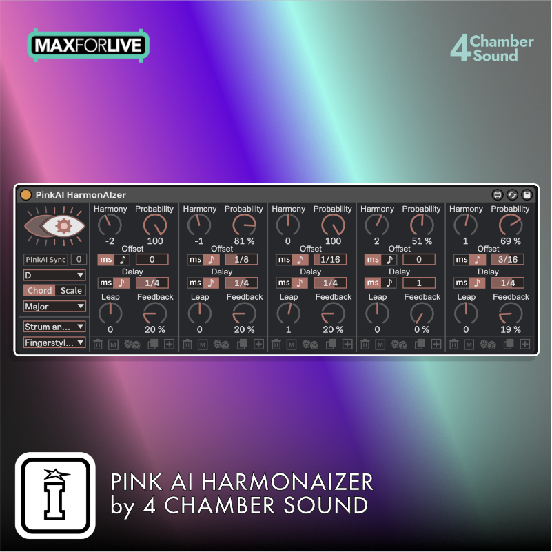 | Description: | PinkAI HarmonAIzer transforms the simplest MIDI into captivating and rich harmonic patterns. HarmonAIzer receives any individual MIDI note from any of your MIDI Clips, MIDI Controller Input, or from PinkAI’s Performer Module and creates anywhere from basic-to-intricate, practical-to-abstract reharmonized sequences within your pre-selected scale, using Probability, Note Offsets and Pitch-shifting Feedback loops. With 12 keys, 25 chord types, and over 30 scales to choose from, HarmonAIzer offers nearly 700 tonal colors, making it so simple to explore diverse and astonishing melody, harmony and dynamic musical patterns all the while learning and applying some fundamentals of music theory. HarmonAIzer synchronizes output with the PinkAI Conductor module’s auto-generated or user-programmed chord sequences. HarmonAIzer works both as a standalone device as well as with PinkAI’s Generative Composer. Turning on “PinkAI Sync” lets your pre-recorded MIDI Clips revoice to fit with the generated chords (or chord-based Scales) from the PinkAI Conductor module. Feed HarmonAIzer with MIDI input from PinkAI’s Performer module and generate ever-changing, richly harmonized musical compositions. Modern, flexible and responsive User Interface with 150+ quick-change presets makes it extremely easy to get started. Add, Delete, Copy or Randomize patterns in up to 9 simultaneous harmonized voices with HarmonAIzer’s easy-to-use, engaging and intuitive user interface. Select from 9 different built-in Preset Banks to learn how HarmonAIzer excels at creating vibrant, harmonized arpeggios (“Rainbows”), elaborate melodic patterns (“Color Riffs”), polyphonic polyrhythms (“Polyrhythms”), practical strumming patterns (“Strum and Pick”), and much more! Combined with the variety of tonal colors, HarmonAIzer offers 100,000+ possibilities in MIDI output by using the same single MIDI Note input. |