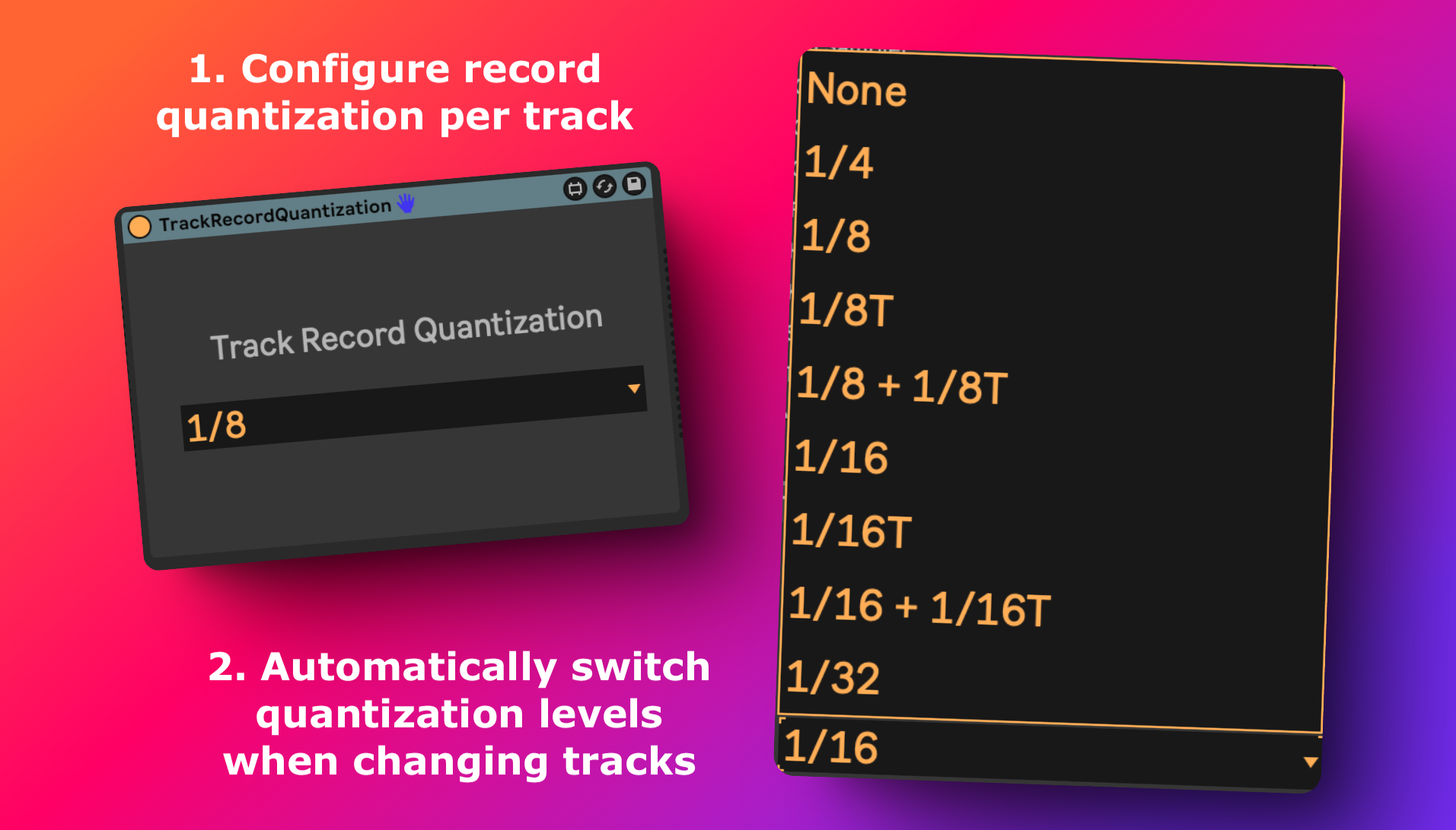 | Description: | Configure record quantisation levels per track. Switching between tracks sets the record quantisation level configured for that track. Perfect for live looping scenarios. |