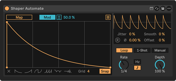 Description: Simple fork of the built-in Shaper device in Live 12 to allow automation and modulation to the Modulation Amount when in 'Mod' mode and 'Min' and 'Max' when in 'Remote' mode.