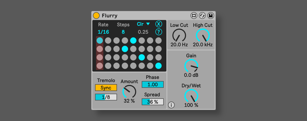 | Description: | Flurry is a Max for Live audio device that combines spectral freezing with a 4-voice sequencer to create lush soundscapes and dynamic rhythmic effects. Key Features: - Fully-featured sequencer with three playback modes (Clear, Envelope, and Sustain) and up to four independent voices. - Design complex textures with filtering, tremolo, and stereo spread. - Fully optimized for Ableton Push controllers. Compatibility: - Requires Ableton Live 11/12 Standard (with the Max for Live add-on) or Ableton Live Suite. |