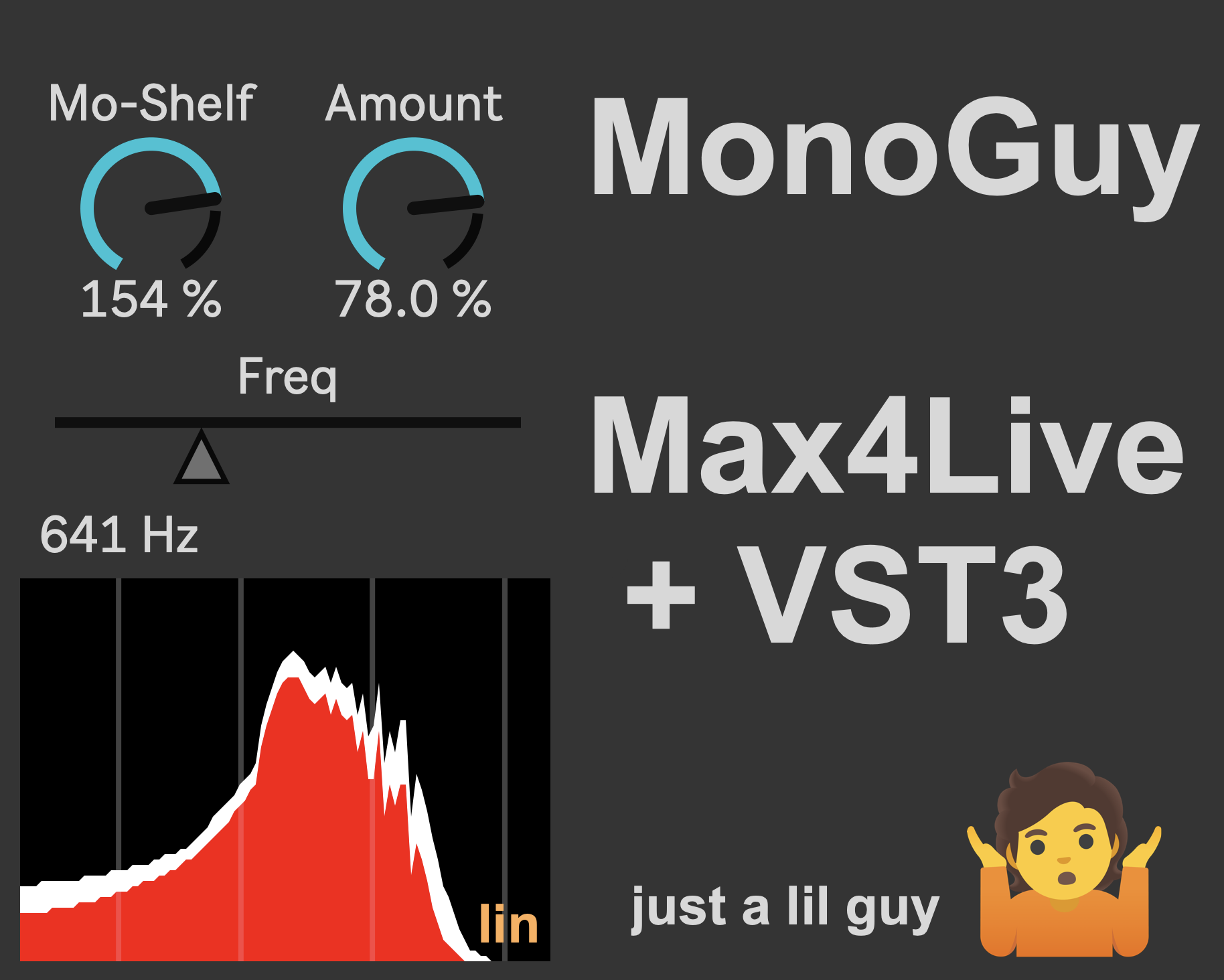 | Description: | Mono Maker with frequency cutoff and amount control and a linear/logarithmic spectrum difference display. The display is not 100% accurate, just a fun lil thing to look at. VST3 version here: https://pale-prince.itch.io/monoguy |