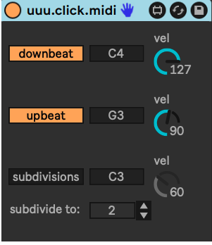 uuu.click.midi generates midi notes that can be used with a midi instrument of your choice for a click track. you can customize the midi notes and velocities used for downbeat, upbeat, and subdivisions. you can also change the number of subdivisions. |