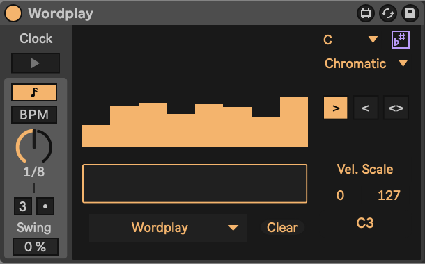 | Description: | Wordplay is a creative text based sequencer. Features: - Letters are assigned to midi notes in ascending order - Each text input is saved to a menu and can be recalled - Forward, backward and ping-pong play modes - Sequences can be locked to scales (scale aware included) - Velocity can be randomized within set parameters - Sync to Live or free running - Text menu items are saved with Live set https://www.youtube.com/watch?v=XfcMw3nIYhY |