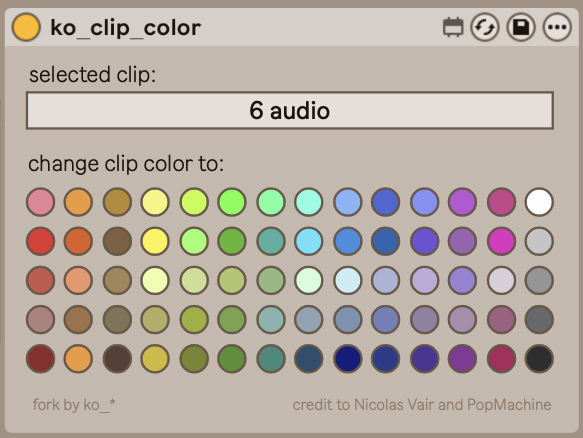 | Description: | change the color of a selected clip *a fork of popmachine's fork of nicolas vair's patch i refactored it so its easier to work on and fixed a bug where the color sometimes wouldn't change sidenote: i feel weird posting this since my changes were relatively minor. it'd be cool if device pages had a section for remixes. |