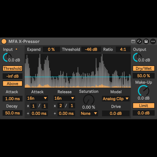| Description: | Tempo-Locked Dynamics Processing: Designed by Ableton Certified Trainer Noah Pred X-Pressor offers BPM-synchronized dynamics control: attack and release are both governed by base rate with multiplier and divisor controls along with an optional millisecond adjustment. This comes after optional input gating (or crossover) and prior to output limiting and parallel blend. Throw in a pre-compression expander and post-compression saturator and X-Pressor is a one-stop dynamics processing powerhouse. NEW IN v1.1 Automatic Make-Up gain toggle Interface improvements Already comes included in: X-FX. |