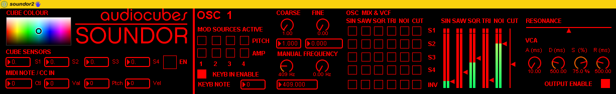 | Description: | Soundor is an fm synthesizer created for the AudioCubes, smart cubes for creating sound, music and visuals (www.percussa.com) SOUNDOR features 4 oscillators each with their own waveform mixers, allowing the user to mix sine, square, sawtooth, triangle and noise waveforms to create totally new kinds of waveforms. Each oscillator section also features a state variable filter (SVF), and can modulate any other oscillator in pitch and/or amplitude. Each oscillator's output can also be sent via its own ADSR to a master out, for lots of sound possibilities. Oscillators can overdrive each other through the built in waveform mixer, and can be controlled through the MIDI Keyboard as well as manual settings. SOUNDOR integrates seamlessly with AudioCubes: rather than having to MIDI map the AudioCubes onto parameters in SOUNDOR, the moment an AudioCube is plugged in, it is automatically connected to any of the waveform mixer parameters and filter sections, through an easy to use connection matrix in the synthesizer. |