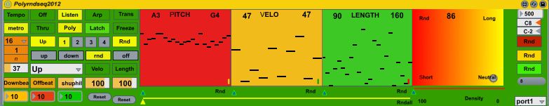 | Description: | do u remember the polysix arpeggiator? if u press n keys it will repeat this n notes with the possibility to change the note range one oktave 2oktaves or fullrange. it was missing a rnd function. this device can listen to a sequence and then play back the sequence but with interchangeable and randomizeable pitch velocity and length. u also can use the ARP mode wich copys the behavior of the polysix i.e. n keys hold down will make a sequence that is n steps long.the plan was to have multiple instances wich could be fed from one keyboard. There i got stucked because live crashed if 2 instances recieving the same notes...also it would be better to make a jitter table to manage pitch velo and time...I need ur help...please sorry there is no manual and to find out how itz working ull need time |