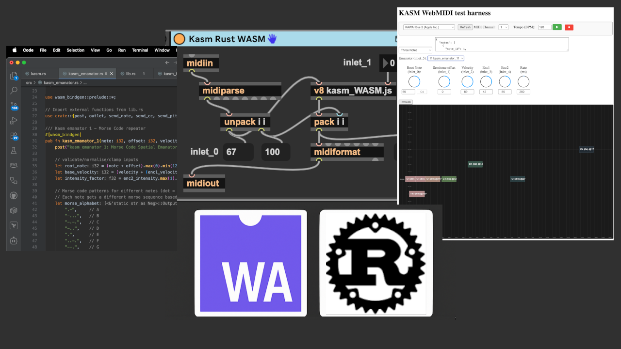 | Description: | Create your own complex Live4Max and WebMIDI instruments and effects in Rust! Manipulate Ableton Live note dictionary data to create MIDI transformations, MIDI generator plugins, drum machines, step sequencers, and arpeggiators and make it fun with high frame rate interactive visuals. Some ideas for using the Kasm Rust SDK in Ableton Live: - Create cool-looking VST wrappers for third-party plugins. - Hook into WebXR and use AR to control virtual instruments. - Design smarter X/Y controllers with visual feedback, unlike Ableton’s blank ones. - Monitor our live performance for trigger patterns to automate things like changing the scene. - Integrate with pitch detection (autotune) to trigger live events on the mixing desk, adjust monitor levels, set off lighting effects etc. - MIDI tape loops playback the last half bar repeatedly, applying fast Rust-compiled algorithms with fade and counterpoint harmony. - Bangaz hits drum racks algorithmically in Rust, adapting to your playing style. - Fill gaps in Ableton Live using your favorite plugins and other DAWs. - Simulate real instruments by applying physical rules around fingering, note repetition etc The Kasm Rust SDK provides examples including Max4Live devices that show how to hook into Ableton MIDI Generator and MIDI Transformation, with full source code, build scripts, and a WebMIDI test harness to hear your Rust code directly in the browser. Since Kasm uses WebAssembly, you can develop and test things in a web browser too. Try it here: https://pyrmontbrewery.com/kasm Cross platform WebAssembly development includes: - Instant feedback loops for testing harmonic analysis, chord detection, and algorithmic composition outside Max editor. - Visual debugging via web browser DevTools and IDEs for performance profiling and memory analysis, unavailable in traditional Max4Live. - Efficient MIDI manipulation using Rust in Ableton Live 12.2 with Max4Live through WebAssembly in the new V8 JavaScript engine. Features: - Pass parameters from JavaScript into Rust and back. - Rust calling Max4Live outlet functions to play chords offset by semitones. - Debug messages from Rust appear in Max console. - Web browser test harness to run Ableton Live WebAssembly in Chrome/Firefox. - Monitor musical key changes and chord progressions. - Detect live musical patterns to trigger Ableton and third-party plugins. - Live MIDI looping with counterpoint harmonizing. - Drum machine, step sequencing, arpeggiators. - Animated backdrops, visualizers, and smooth VST wrappers for Max4Live devices. Examples of MIDI triggering from Rust code are available on SoundCloud playing various VST instruments. How Kasm works with Max4Live/V8: - Rust code compiled to WebAssembly for MIDI/Audio DSP logic. - JavaScript bridge layer handles WASM loading and parameter marshalling. - Max4Live provides jweb and V8 JavaScript engine inside .amxd device for two-way communication with Rust/WebAssembly. Kasm SDK also abstract some nuances around base64-encoded WASM binaries compiled for integration: - Custom atob() implementation for Max4Live. - Function export and caching for Rust functions accessible to JavaScript. - WASM memory string conversions for JavaScript. - Max console debugging !! Note: Requires Ableton Live 12.2 or later with V8 engine support (Suite or Standard + Max4Live add-on). !! Building and updating is easy with: - npm install - npm run build This updates kasm_WASM_rust.js, which compiles the WASM; then paste it into any 'v8' Max4Live object. Students also get a 30% discount, use KASMSTU at the checkout Documentation, instrument patch editors and so on is all here: https://kasmsdk.github.io |